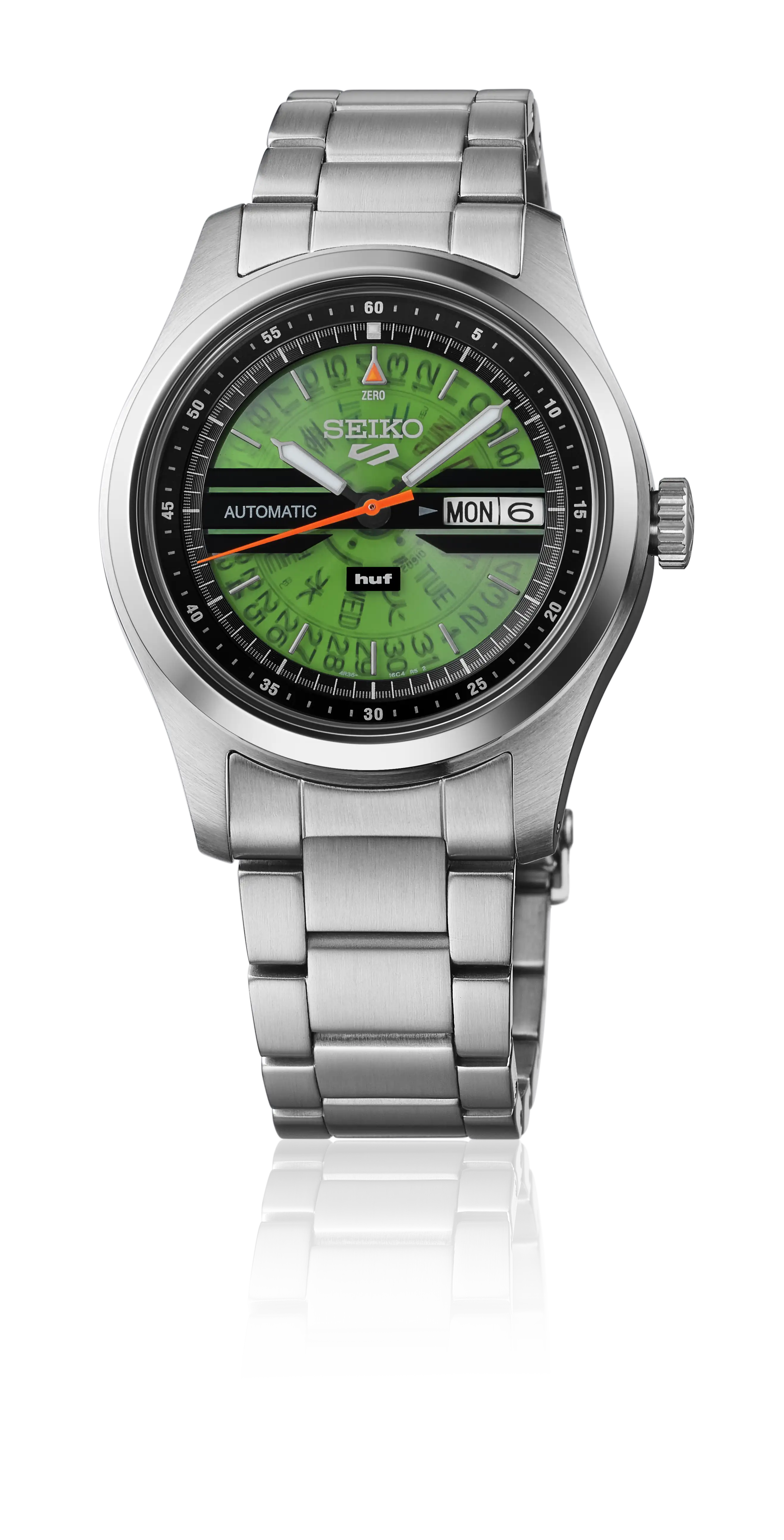 Le calibre 4R36 Seiko affichant le jour/la date est un calibre mécanique. La montre se recharge automatiquement en la portant et en transformant les mouvements du bras et du poignet de la personne en énergie. Le mouvement de la montre fait en sorte que le ressort principal de la montre soit remonté. Ce ressort est une source d'énergie. Il est également possible de le remonter à la main.Lorsque la montre est entièrement chargée, elle a une réserve énergétique d'env.41 h La fréquence d'oscillation de cet automate est de 21.600 par heure et la montre possède 24 bijoux. Le calibre 4R est entièrement fabriqué en interne.